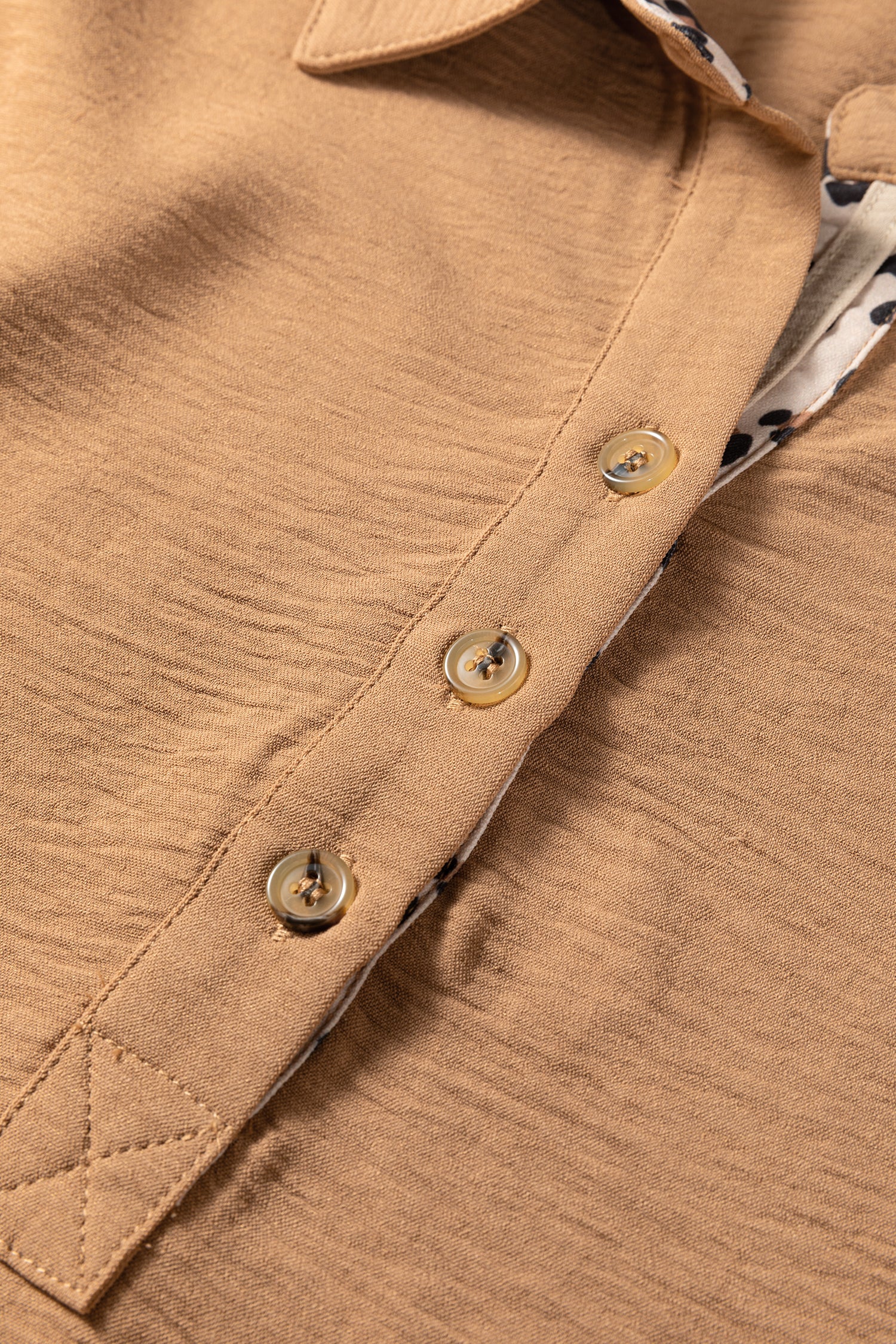 Camel Contrast Leopard Print Patchwork Polo Collar Buttons Front Ruffled Long Sleeve Blouse