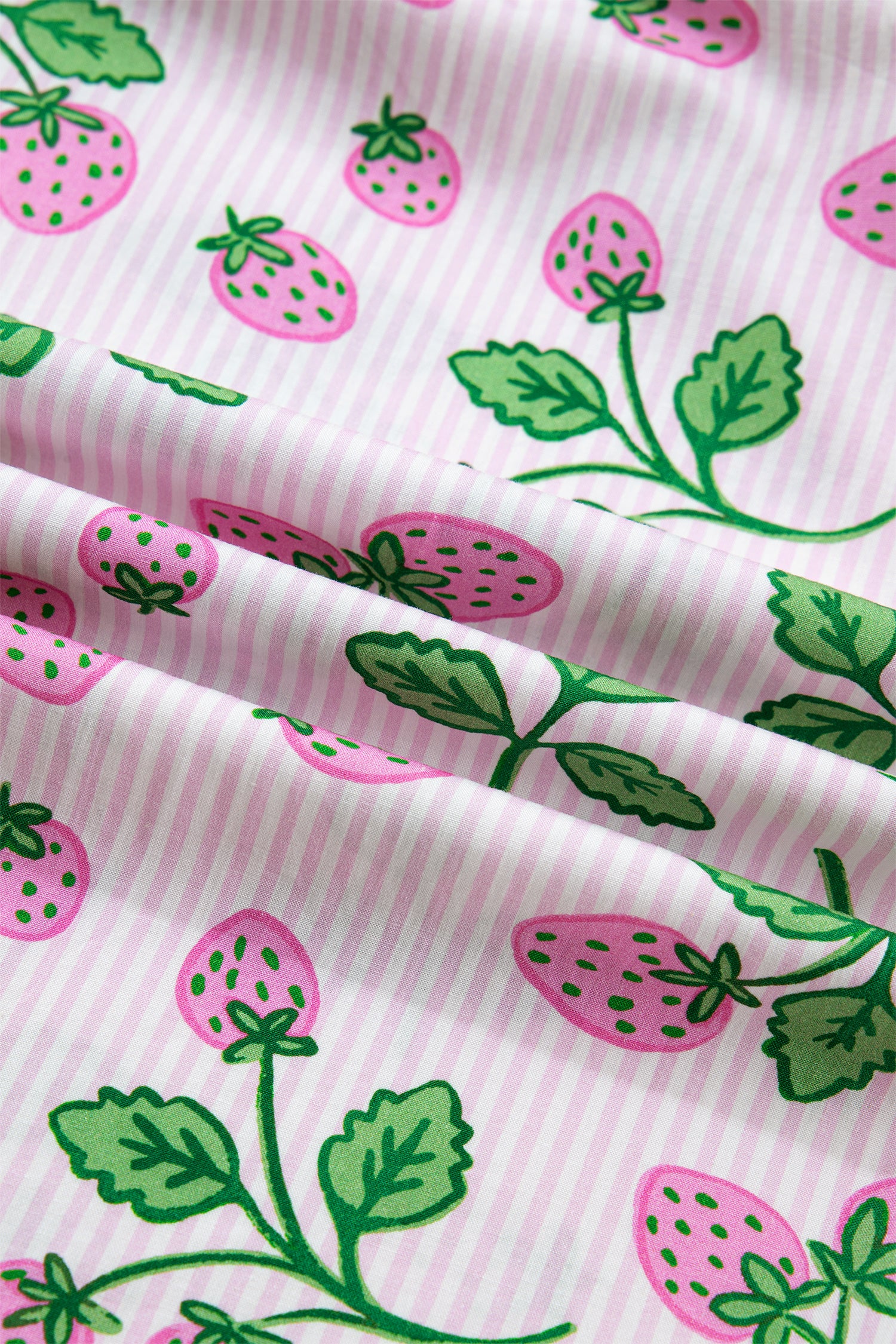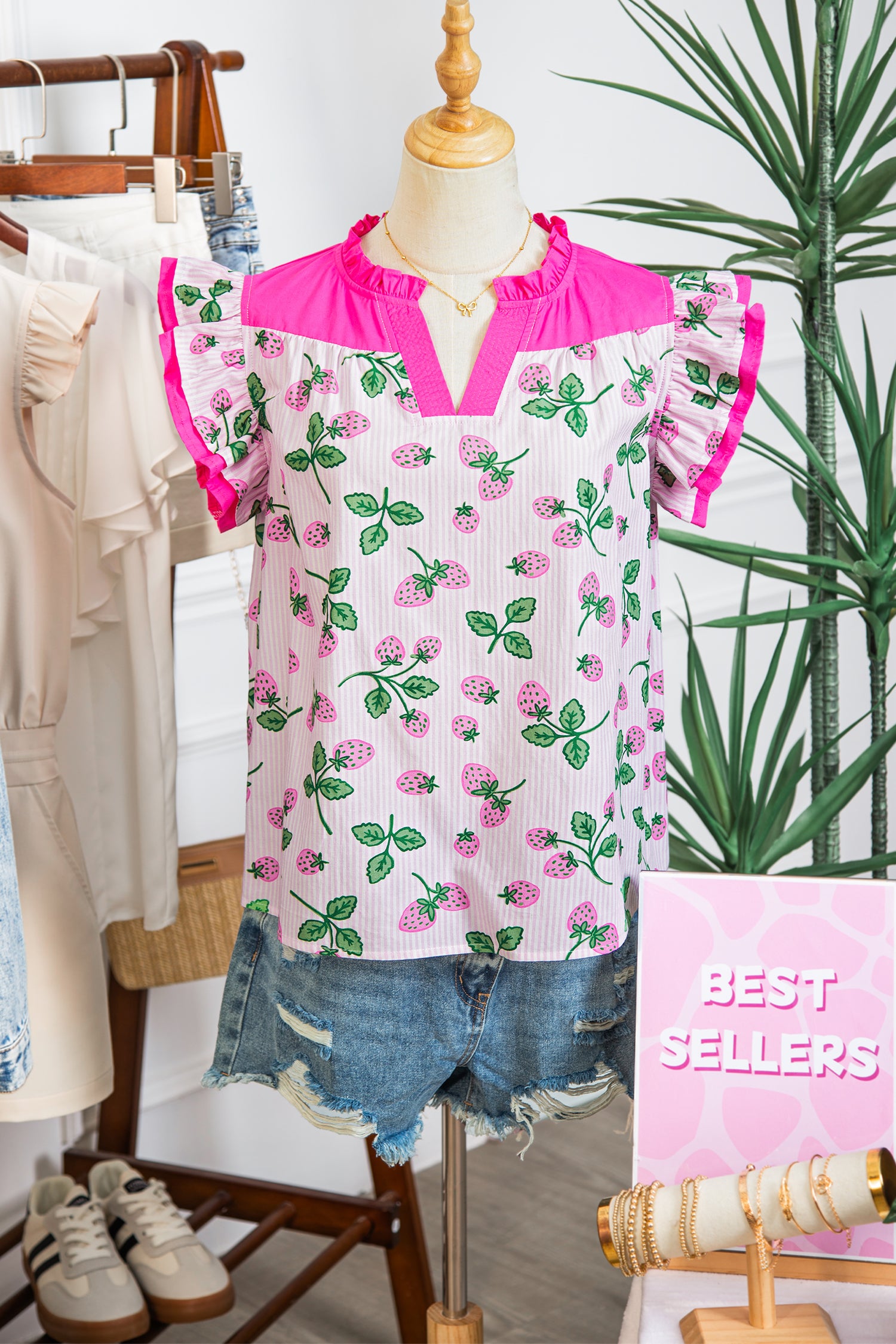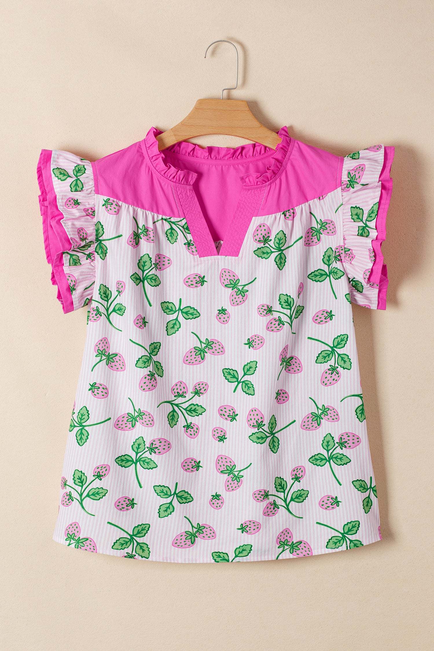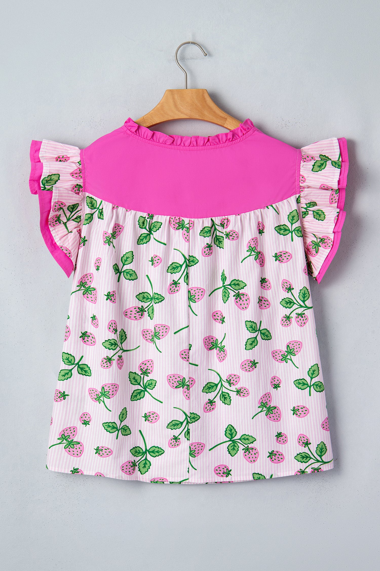 Pink Striped Strawberry Printed Color Block Patchwork V Neck Flutter Sleeve Blouse